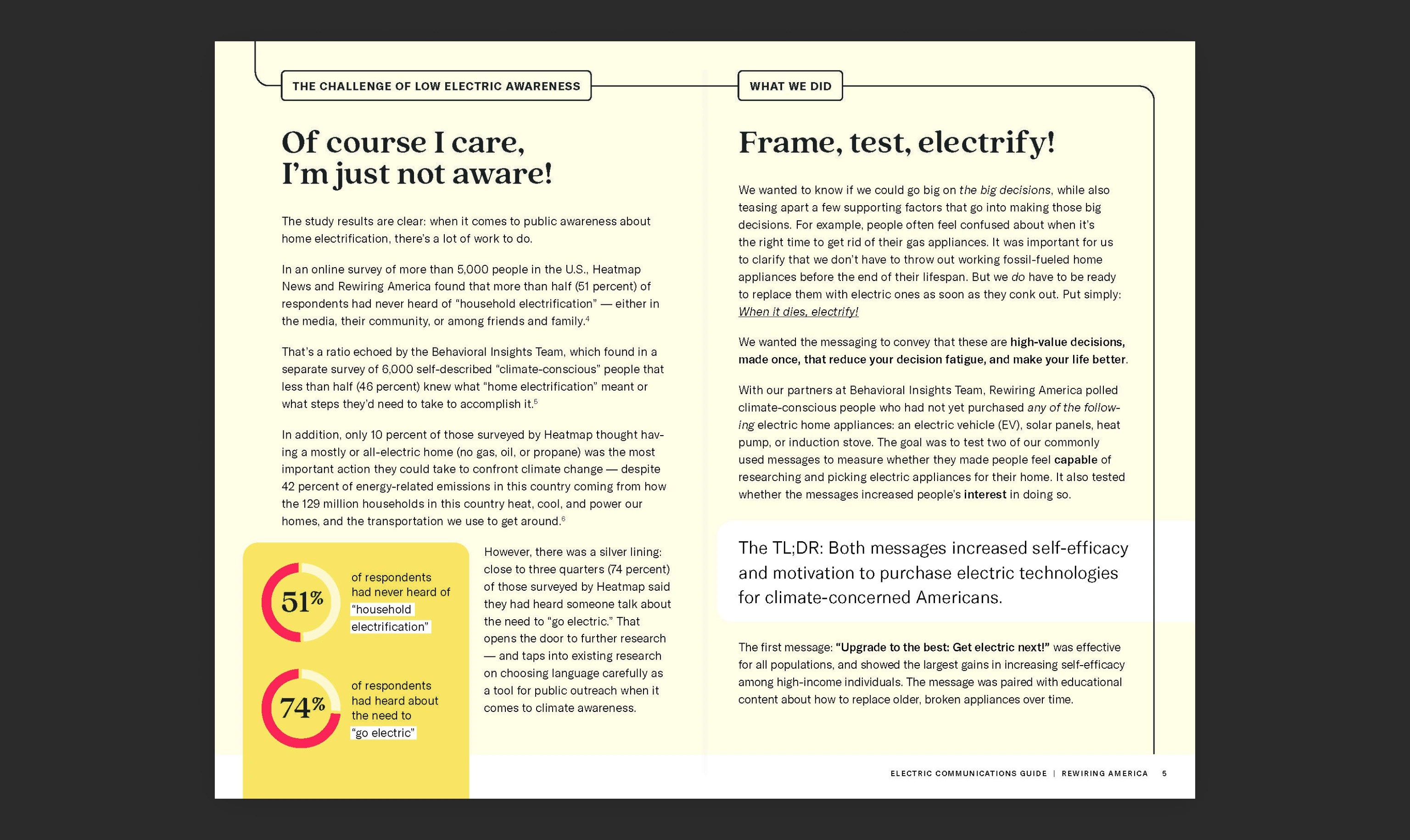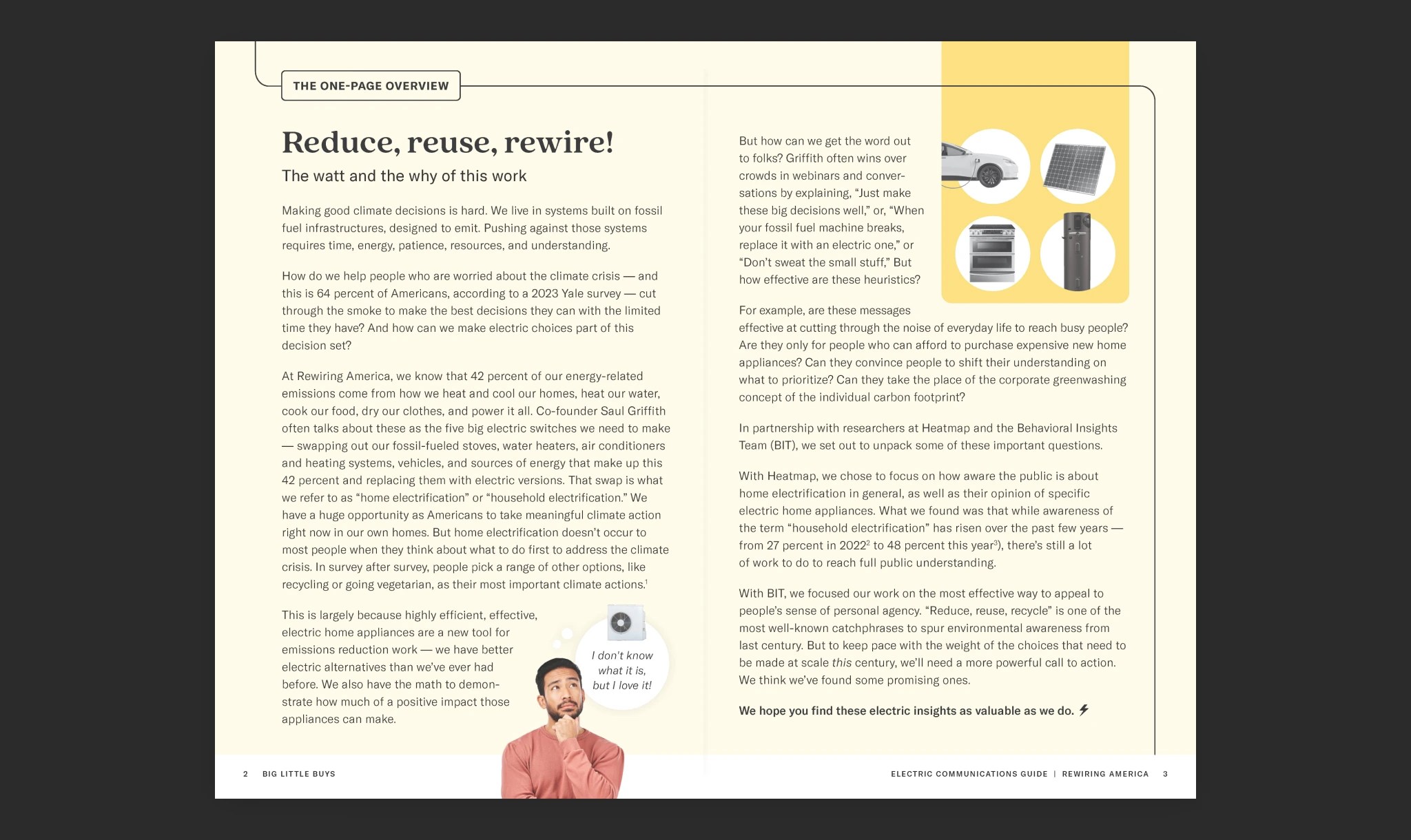 My role as a designer at Rewiring America is focused on supporting the brand, marketing, and communications teams. This includes designing research reports and one-pagers, creating social media carousels, and building new web pages. With a heavy focus on data and policy materials, much of my creative problem-solving centers around distilling complex information into digestible, simplified visuals.